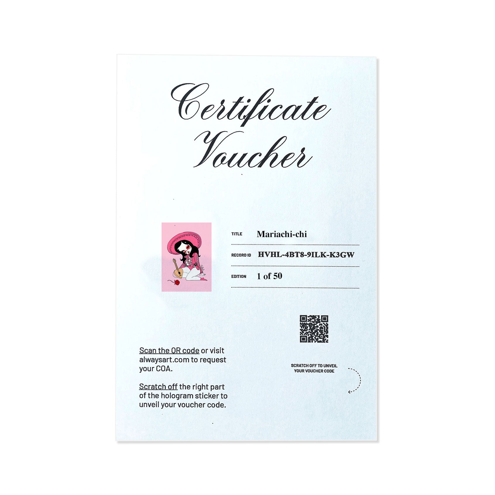 Each print will be numbered and will include a voucher to register your print and receive your official Certificate of Authenticity by Always Art.